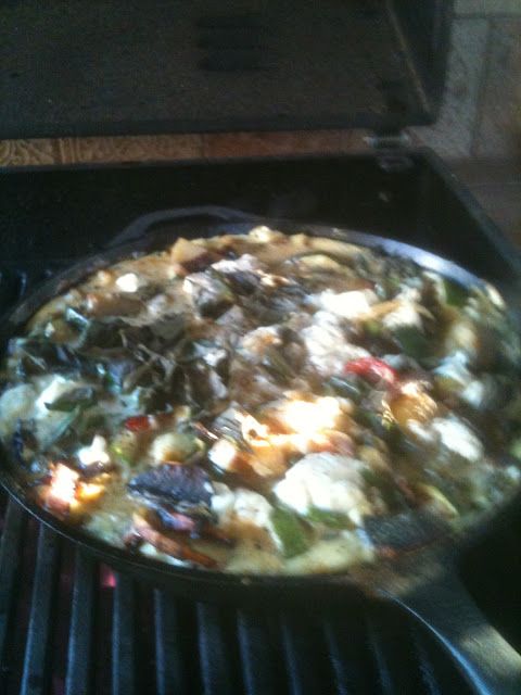 The above photo shows potatoes and red peppers cooking in the cast iron skillet that would cook the frittata, an herbed potato dish cooking in an aluminum foil packet and a marinated Swiss chard vegetable medley (which included onion, more zucchini, mushrooms and soy sauce) in the grill basket.