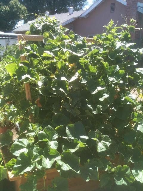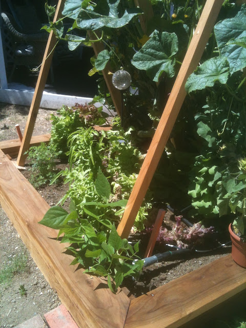 I spent quite a long afternoon, last week, dealing with a bumper crop of cucumbers. Apparently, the trellis that my husband built, to prolong our lettuce crop, made the cucumbers very happy! The cucumbers climbed it rather fast, providing a nice afternoon shading for the lettuce below.
